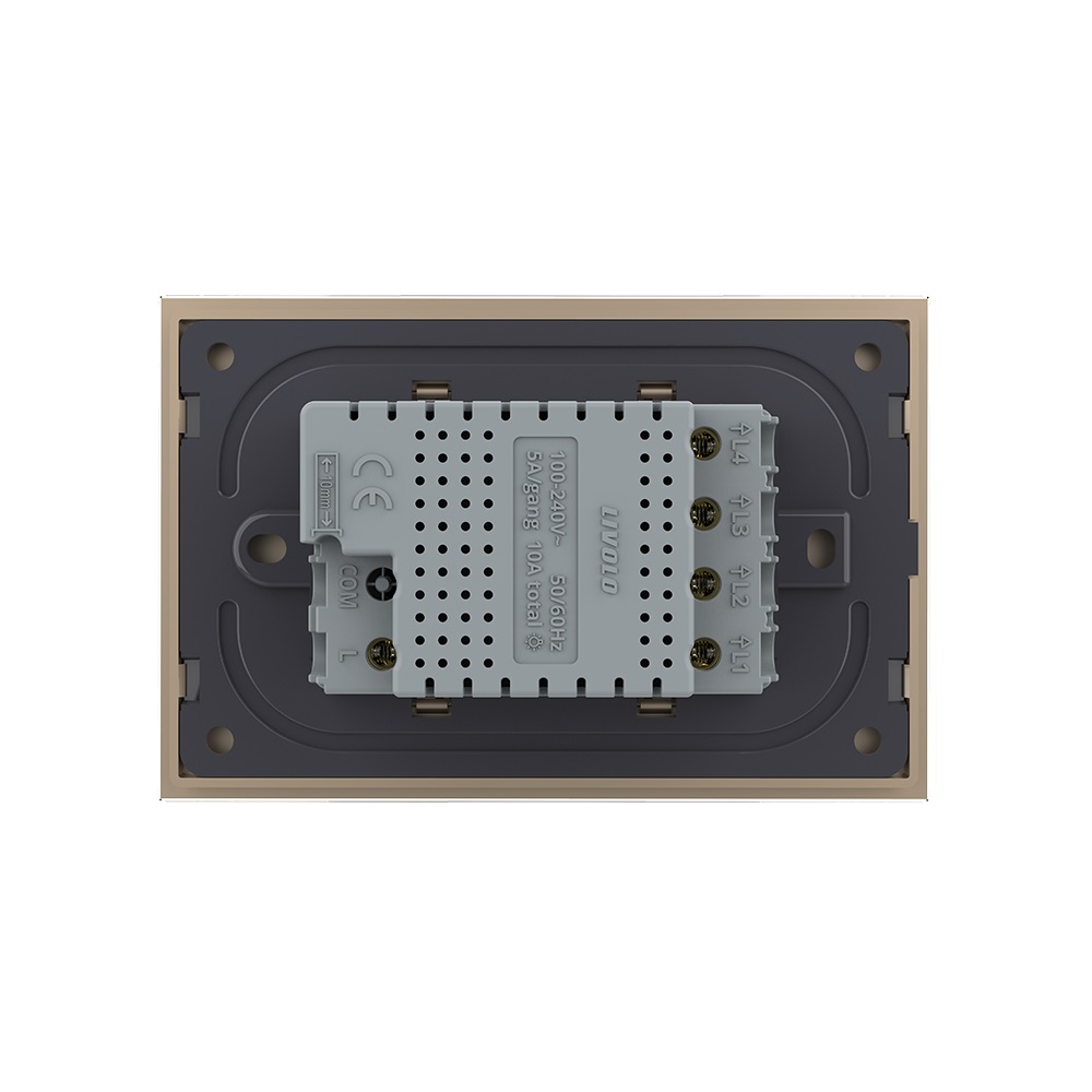 Intrerupator cvadruplu cu touch Livolo cu rama din sticla, standard Italian, cu textura de crystal, indicator de lumina, rezistent la umiditate si la zgarieturi, rafinament la superlativ. Intrerupatoarele Livolo folosesc un senzor tactil cu 100 ms timp de raspuns, similar cu tehnologia folosita la smartphone-uri. Panoul din sticla al intrerupatorului, este din sticla securizata, rezistenta la foc. Ledul rosu/albastru indica statusul on/off al intrerupatorului.