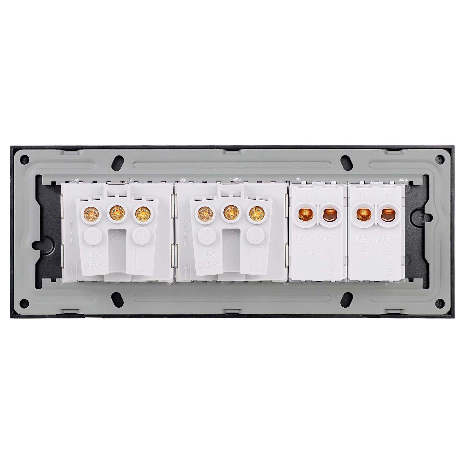 Intrerupator dublu + 2 prize cu rama din sticla LUXION, standard Italian, 6M – solutia ideala pentru casa sau spatiul tau. Bucura-te de un design rafinat si functional, cu atentie la detalii. LUXION se integreaza perfect in orice mediu. Astfel poate fi montat nu doar in casa, ci si in spatii precum: birouri si spatii comerciale, spatii HoReCa, showroom-uri si sali de prezentare, depozite si spatii industriale moderne, cladiri rezidentiale sau de birouri. Intrerupatoarele 6M sunt compatibile cu Doza Rigips 6M si Doza Incastrata 6M.