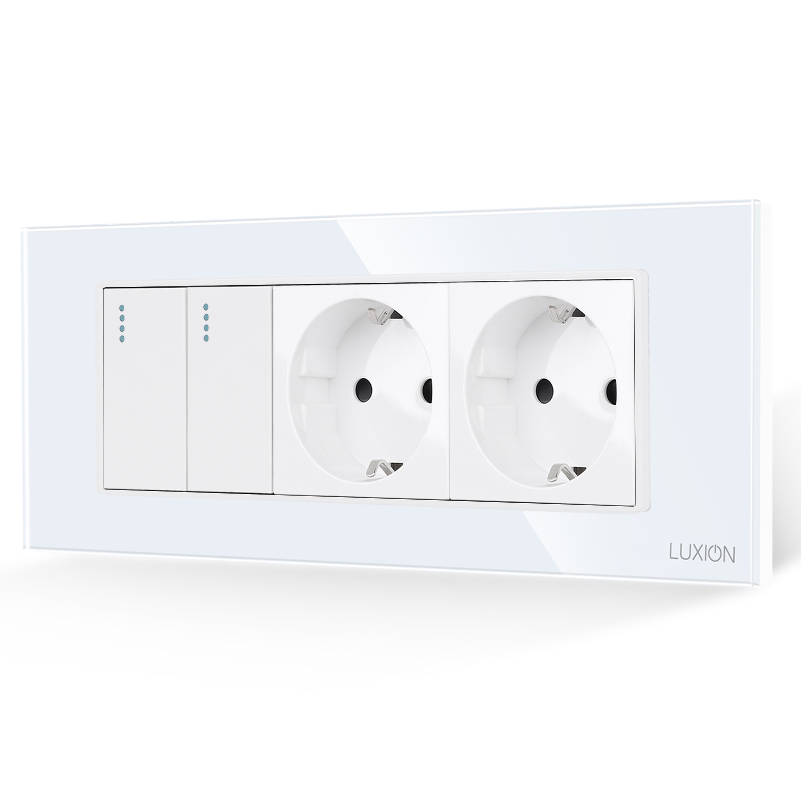 Intrerupator dublu + 2 prize cu rama din sticla LUXION, standard Italian, 6M – solutia ideala pentru casa sau spatiul tau. Bucura-te de un design rafinat si functional, cu atentie la detalii. LUXION se integreaza perfect in orice mediu. Astfel poate fi montat nu doar in casa, ci si in spatii precum: birouri si spatii comerciale, spatii HoReCa, showroom-uri si sali de prezentare, depozite si spatii industriale moderne, cladiri rezidentiale sau de birouri. Intrerupatoarele 6M sunt compatibile cu Doza Rigips 6M si Doza Incastrata 6M.