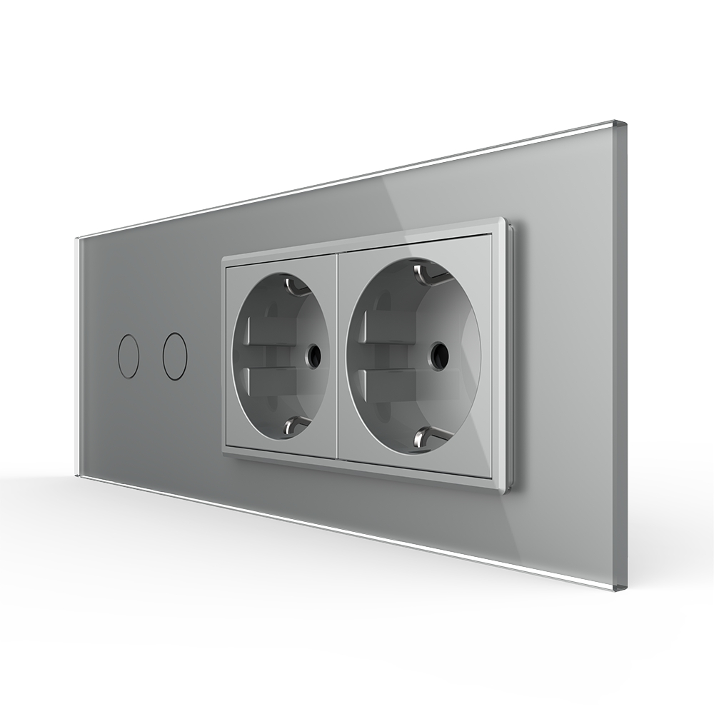 Intrerupator dublu + doua prize Livolo din sticla, standard italian, cu 6 module, din sticla crystal securizata, termorezistenta, compatibil doar cu modulele Livolo. Este rezistent la zgarieturi, umezeala, praf si ofera casei tale un plus de eleganta si rafinament.