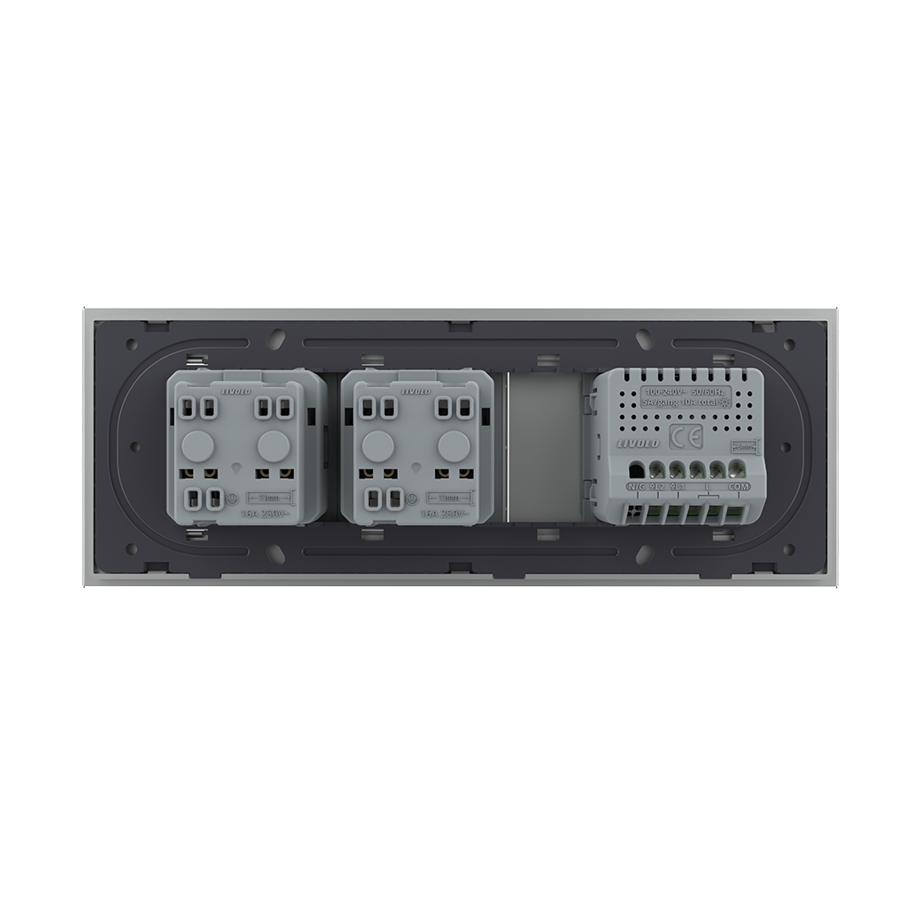 Intrerupator dublu cap scara/cruce + doua prize Livolo din sticla, standard Italian, compatibil cu doza modulara de 6 module cu distanta dintre suruburi 102 mm, compatibil doar cu modulele Livolo. Este rezistent la zgarieturi, umezeala, praf si ofera casei tale un plus de eleganta si rafinament.