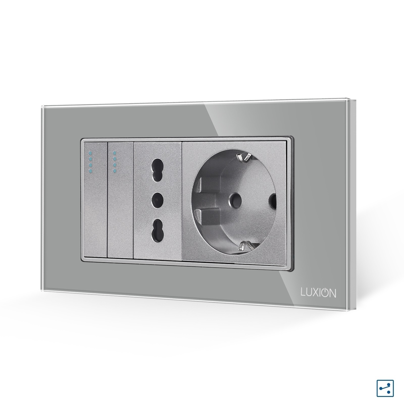 Intrerupator Dublu Cap Scara + Priza Ingusta + Priza Schuko cu Rama din Sticla LUXION, Standard Italian, 4M