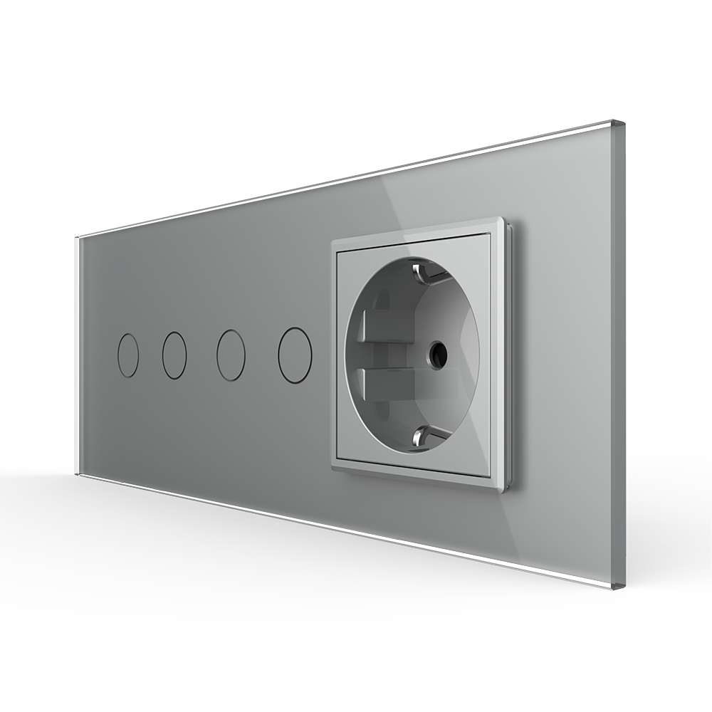 Intrerupator dublu + dublu + priza Livolo din sticla, standard italian, cu 6 module, din sticla crystal securizata, termorezistenta, compatibil doar cu modulele Livolo. Este rezistent la zgarieturi, umezeala, praf si ofera casei tale un plus de eleganta si rafinament. Compatibil cu doza modulara de 6 module cu distanta dintre suruburi 102 mm.