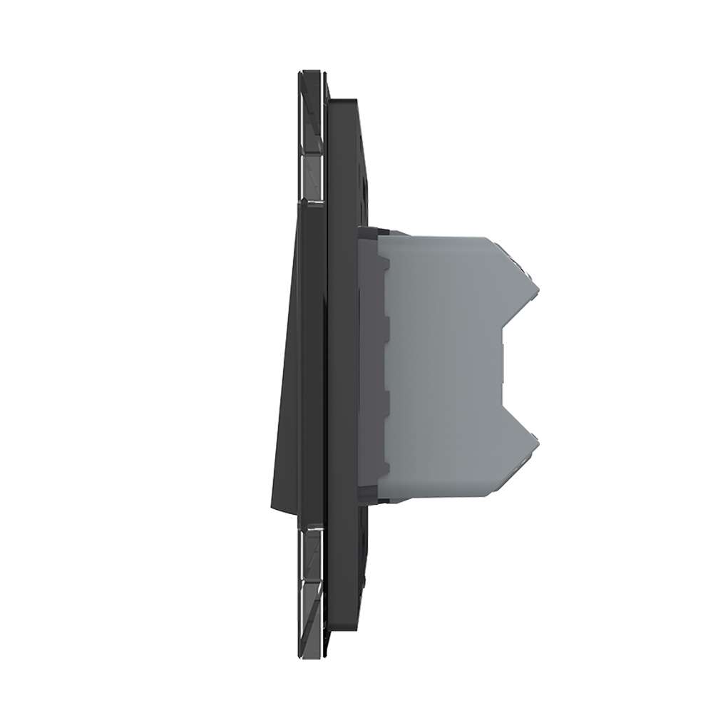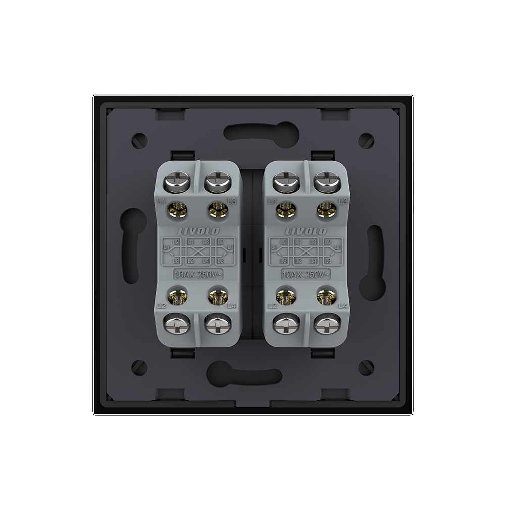 Intrerupator dublu mecanic cap cruce cu rama din sticla Livolo. Produsul este compatibil cu ramele din sticla pentru doze standard german sau doze modulare italiene.