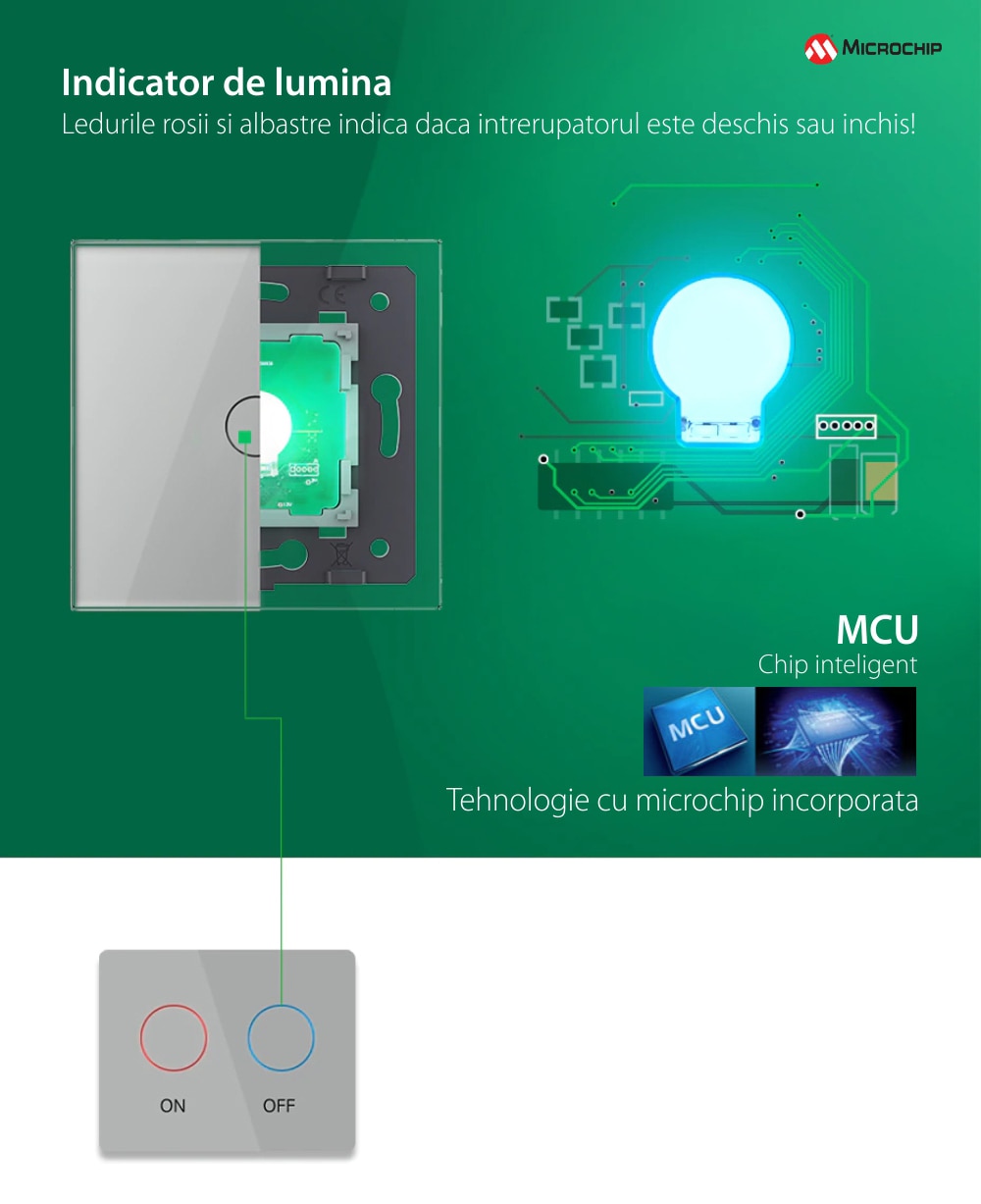 Ledul ilumineaza usor si emite un sunet clar. Ledul rosu indica faptul ca intrerupatorul este pornit in timp ce ledul albastru indica faptul ca intrerupatorul este oprit.