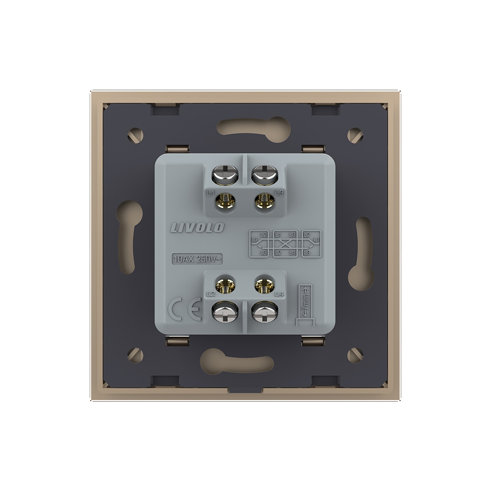 Intrerupator simplu mecanic cap cruce, 2 module cu rama din sticla Livolo. Produsul este compatibil cu ramele din sticla pentru doze standard german sau doze modulare italiene.