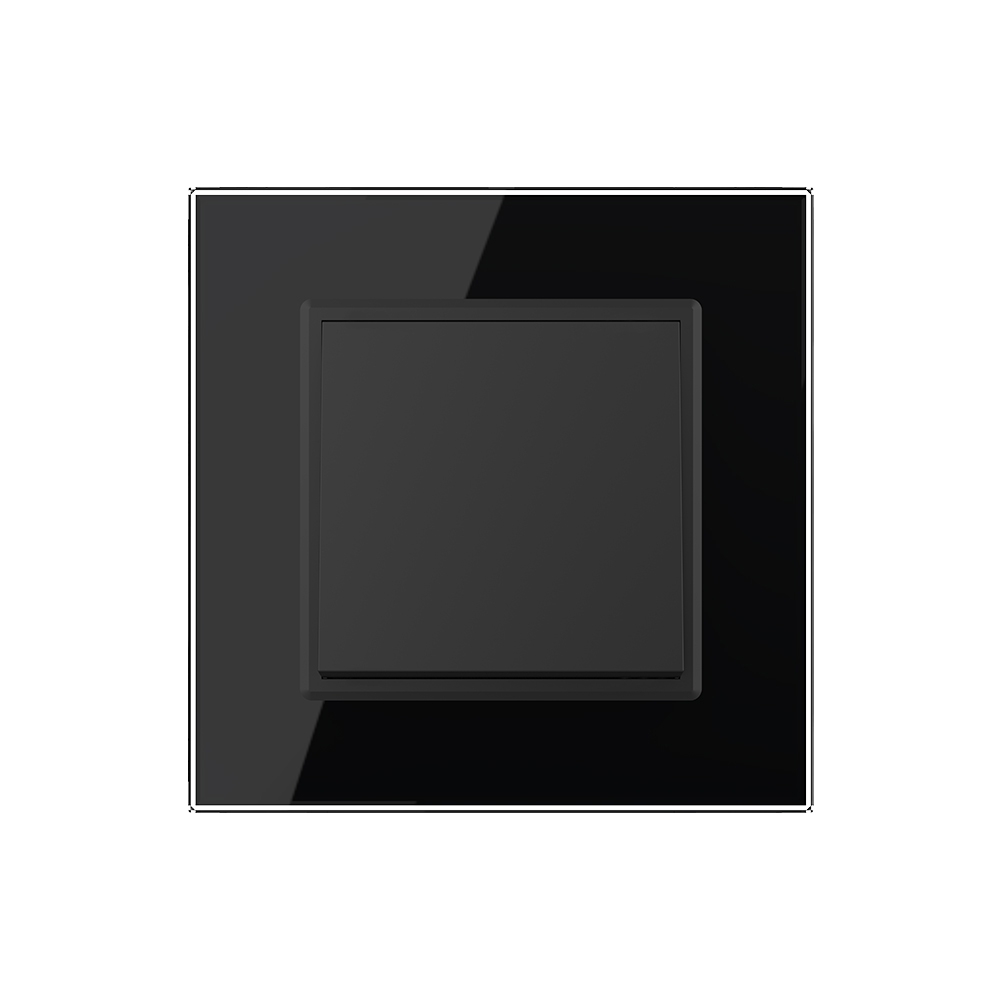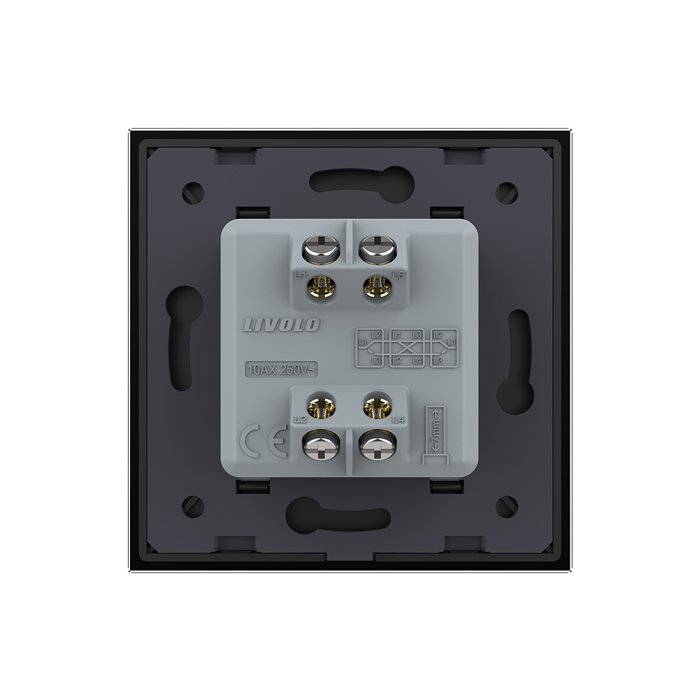 Intrerupator simplu mecanic cap cruce, 2 module cu rama din sticla Livolo. Produsul este compatibil cu ramele din sticla pentru doze standard german sau doze modulare italiene.
