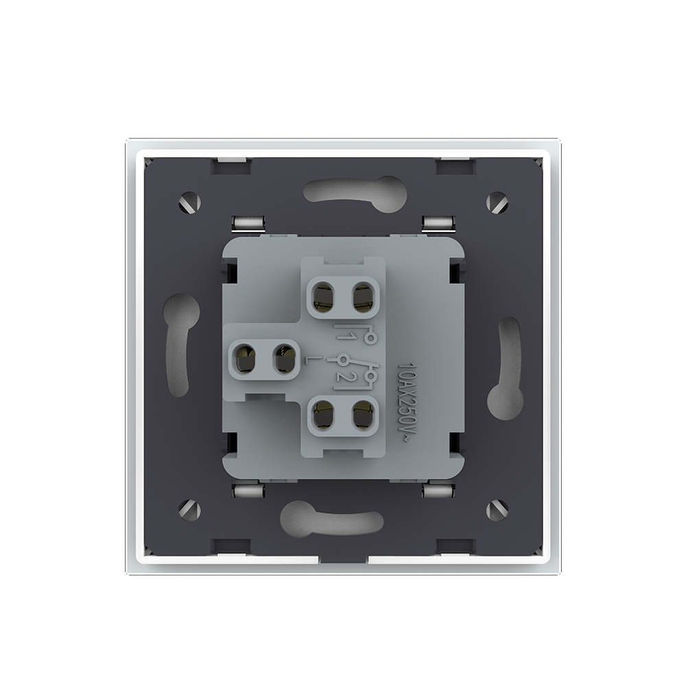 Intrerupator simplu mecanic, 2 module cu rama din sticla Livolo. Produsul este compatibil cu ramele din sticla pentru doze standard german sau doze modulare italiene. Poate fi folosit ca intrerupator cap scara