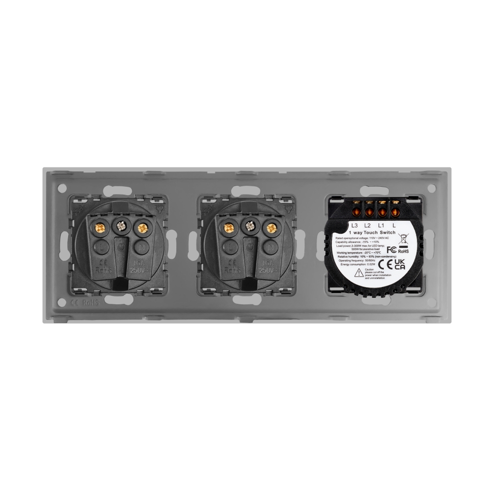 Intrerupator triplu + 2 prize cu rama din sticla LUXION cu design compact, elegant si minimalist. Structura este durabila, iar produsele nu se decoloreaza in timp. Este un produs practic, fabricat din materiale de calitate si rezistente in timp, ce ofera utilitate si confort casei tale.