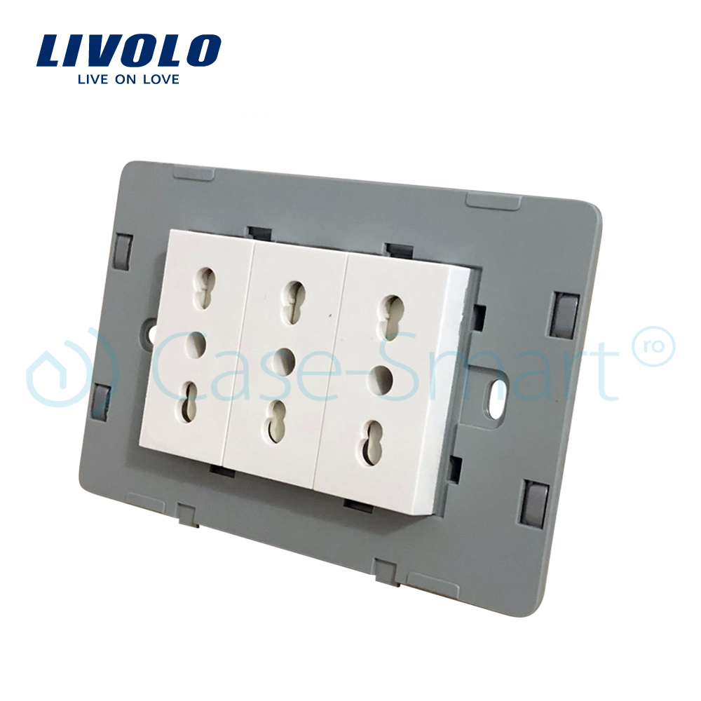 Modul priza tripla Livolo, model italian, pentru case, birouri, spatii comerciale, hoteluri. Produse moderne de inalta calitate. Produsul este compatibil cu doze modulare in 3 module cu distanta dintre suruburi de 85 mm.