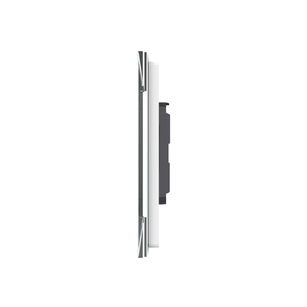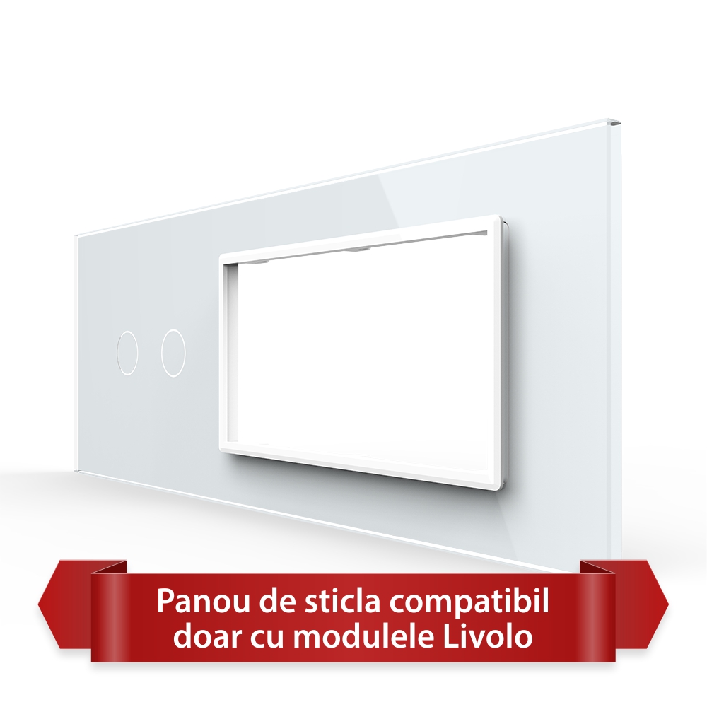 Panou intrerupator dublu cu 2 prize cu touch Livolo din sticla, standard italian, cu 6/7 module, din sticla crystal securizata, termorezistenta, compatibil doar cu modulele Livolo. Este rezistent la zgarieturi, umezeala, praf si ofera casei tale un plus de eleganta si rafinament.