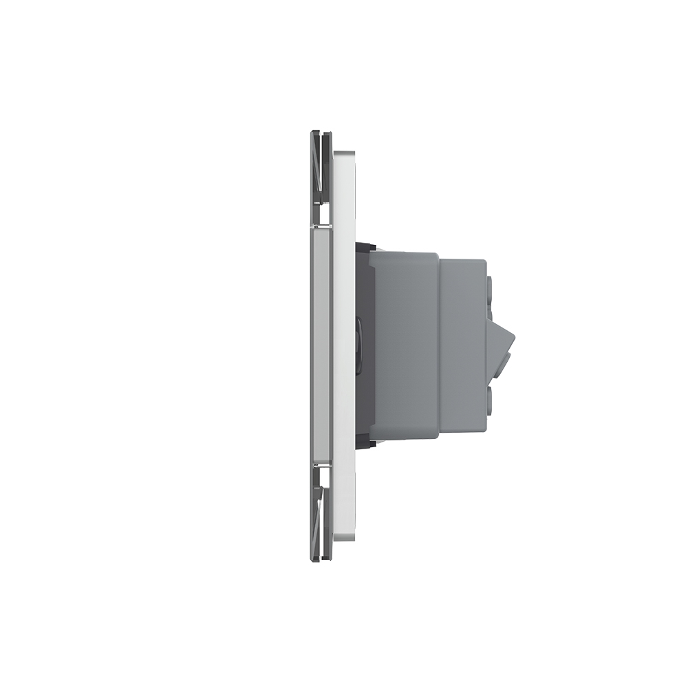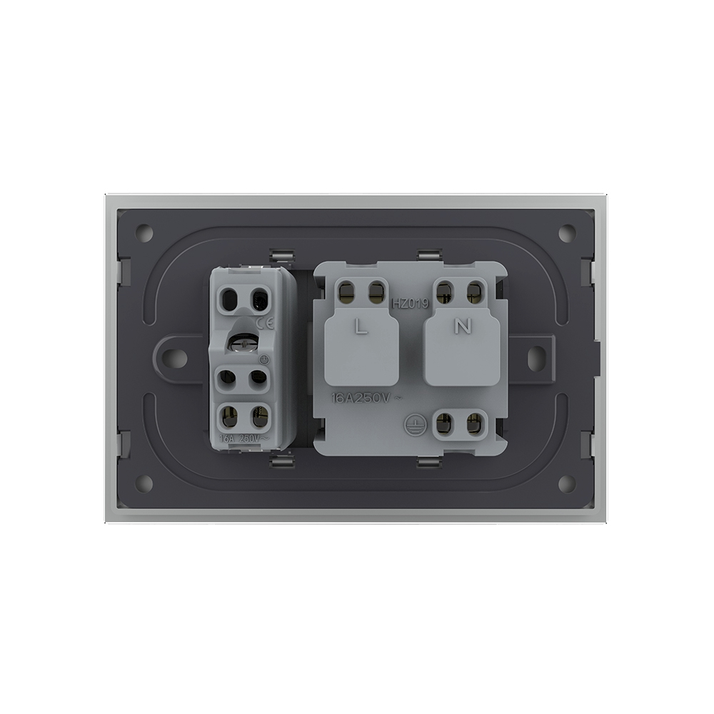 Priza dubla Livolo cu rama din sticla, model italian pentru case, birouri, spatii comerciale, hoteluri. Produse moderne de inalta calitate. Produsul este compatibil cu doze modulare in 3 module cu distanta dintre suruburi de 85 mm.
