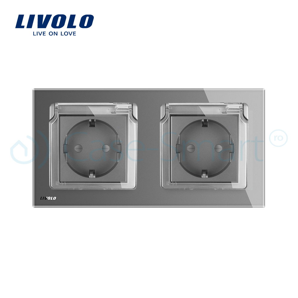 Priza dubla Livolo cu rama din sticla si capac de protectie rezistent la apa