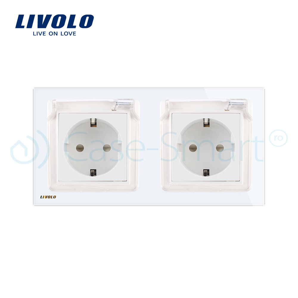 Priza dubla Livolo cu rama din sticla si capac de protectie rezistent la apa