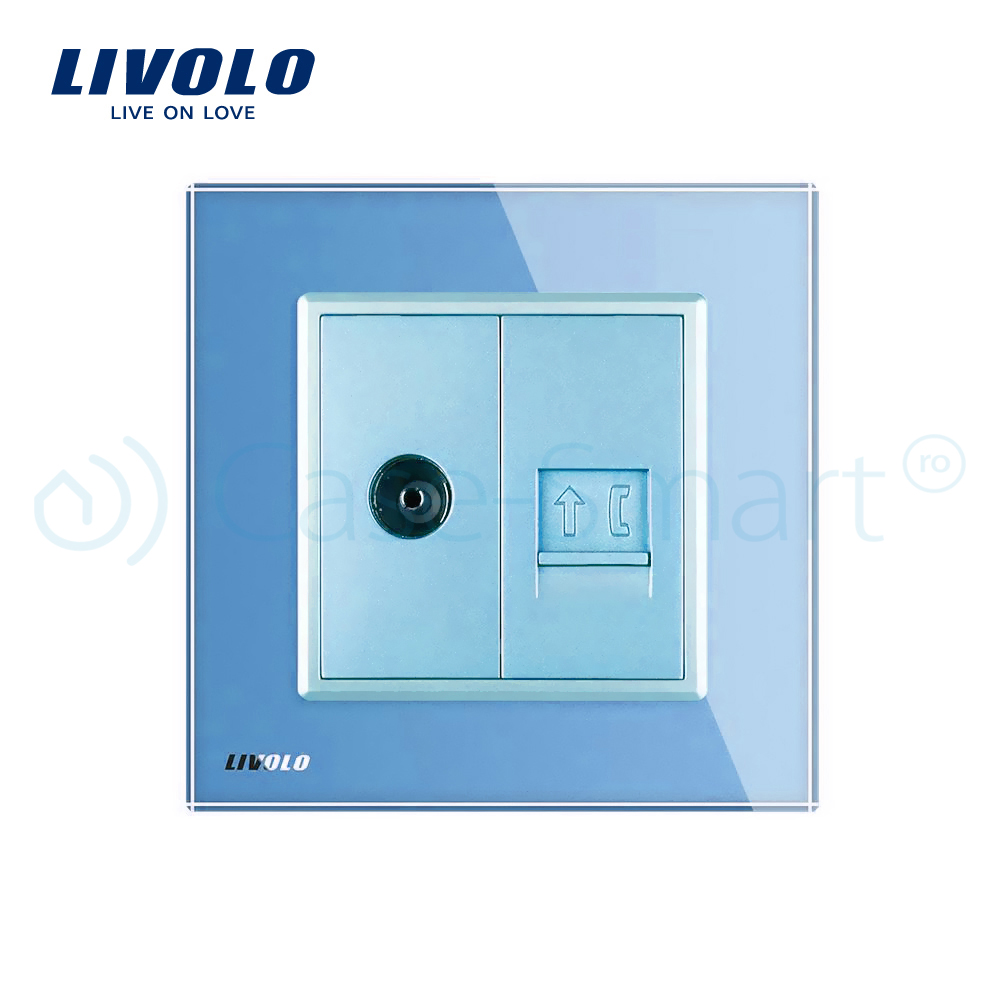 Priza dubla TV + Telefon Livolo cu rama din sticla crystal, rezistenta la zgarieturi, umezeala, praf ofera casei tale un plus de rafinament si confort.