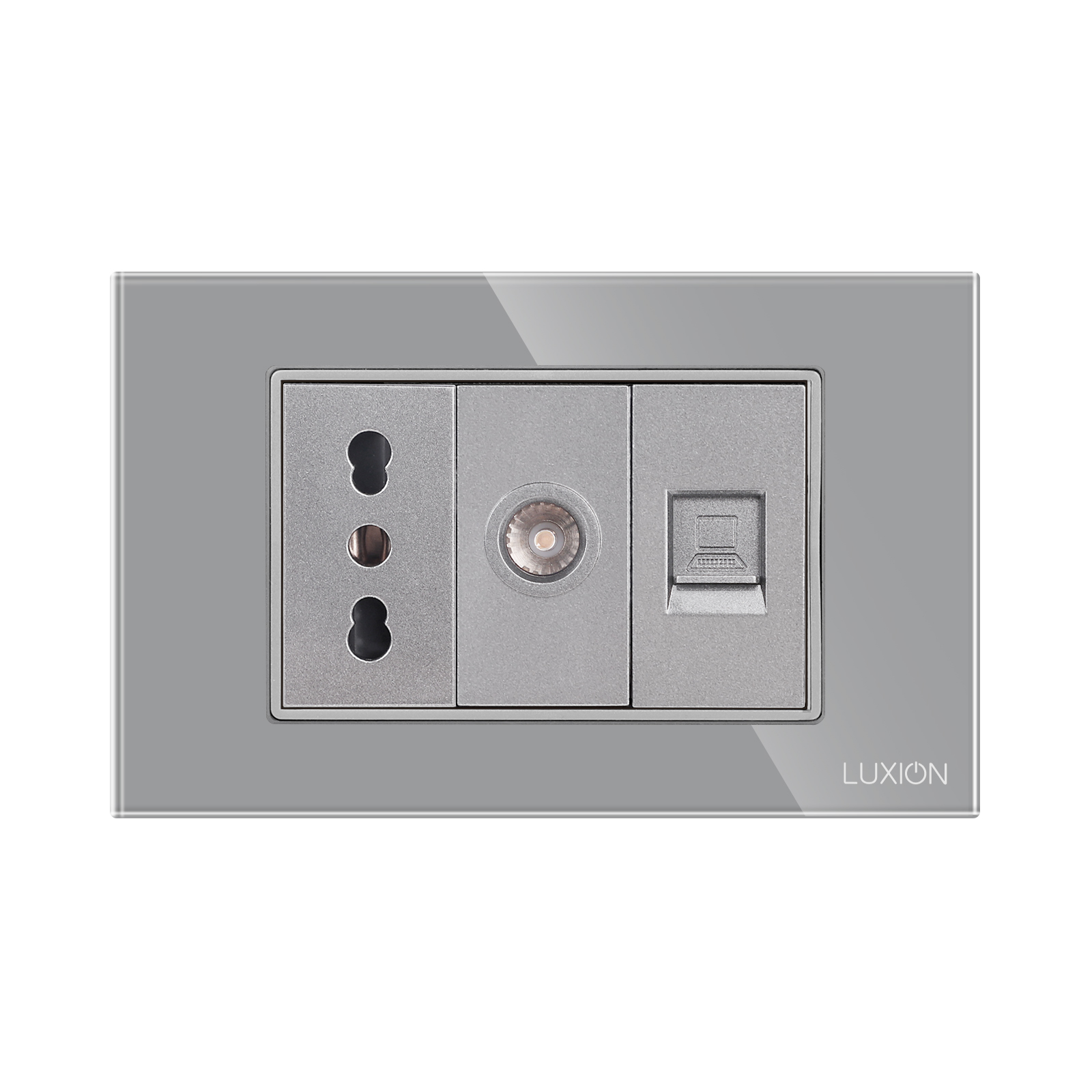 Priza ingusta + TV + internet cu rama din sticla Luxion, standard Italian, 3M – solutia ideala pentru casa sau spatiul tau. Bucura-te de un design rafinat si functional, cu atentie la detalii. LUXION se integreaza perfect in orice mediu. Astfel poate fi montat nu doar in casa, ci si in spatii precum: birouri si spatii comerciale, spatii HoReCa, showroom-uri si sali de prezentare, depozite si spatii industriale moderne, cladiri rezidentiale sau de birouri. Prizele 3M sunt compatibile cu Doza Rigips 3M si Doza Incastrata 3M.