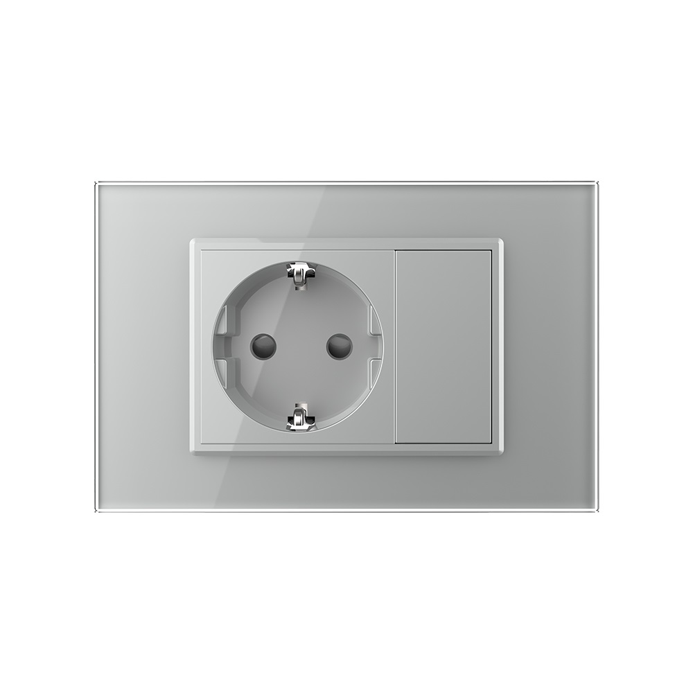 Priza simpla Livolo cu rama din sticla, model italian pentru case, birouri, spatii comerciale, hoteluri. Produse moderne de inalta calitate. Produsul este compatibil cu doze modulare in 3 module cu distanta dintre suruburi de 85 mm.