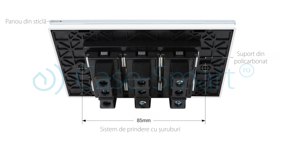 Priza tripla Livolo cu rama din sticla, model italian pentru case, birouri, spatii comerciale, hoteluri. Produse moderne de inalta calitate. Produsul este compatibil cu doze modulare in 3 module cu distanta dintre suruburi de 85 mm.