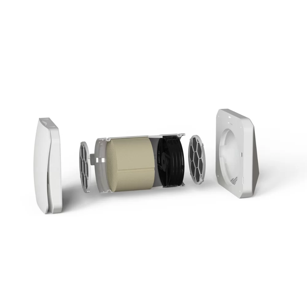 Sistemul de ventilatie descentralizat BSK Zephyr ofera recuperare de caldura si control integrat prin Wi-Fi. Este solutia moderna pentru spatiile unde instalarea unui sistem de ventilatie centralizat cu traseu de tubulatura nu este posibila. Sistemul recupereaza caldura aerului viciat evacuat din incinta utilizand un acumulator de caldura ceramic si un ventilator care functioneaza in ambele sensuri, in cicluri alternative de cate 70 de secunde in care extrage respectiv introduce aer.